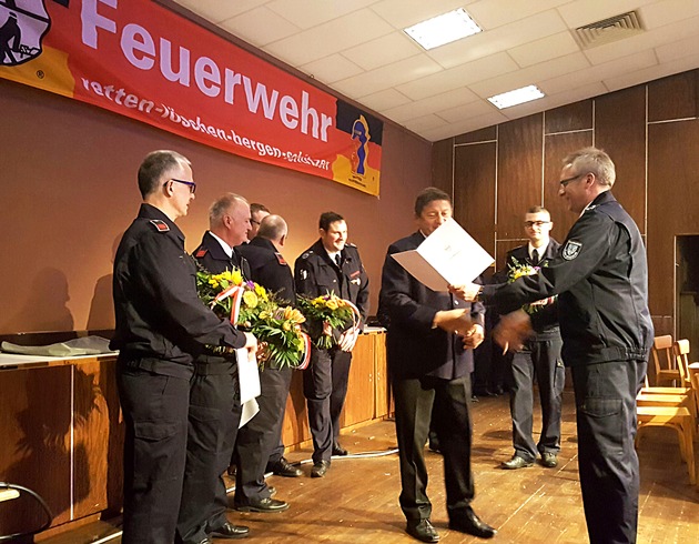 Für 10 Jahre Feuerwehrdienst Verband Deutscher Feuerwehr NRW wurden Julien Düllberg und David Gralka geehrt. Ingo Bertram wurde für 25-jährigen Dienst in der Arnsberger Feuerwehr mit dem Feuerwehr-Ehrenzeichen des Landes Nordrhein-Westfalen in Silber ausgezeichnet. Für 40 Jahre Dienst wurden mit der Ehrennadel in Silber Martin Filthaut, Friedrich Andree, Ludwig Dünschede, Stefan Knobloch, Martin Knoche, Ralph Burchard, Gerhard Kemper, Jürgen Krause, Ralf Schnepp, Reiner Schulze geehrt. Ausgezeichnet für 50 Jahre wurden Erich Knorek und Franz-Josef Berting. Eine besondere Auszeichnung für stolze 60 Jahre Treue zur Feuerwehr wurde Hubert Dünschede aus Voßwinkel.