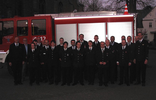 Mit einem Gruß aus der Verwaltung schloss sich Helmut Melchert im Namen von Bürgermeister Hans-Josef Vogel dem Dank an die Wehrleute an. Anschließend führt Melchert die Ehrungen durch. Geehrt wurden für 10 Jahre aktiven Feuerwehrdienst David Eggenhofer, Marcus Schumacher, Christopher Sommer und David Gomes. Das Feuerwehrehrenzeichen des Landes Nordrhein-Westfalen in Silber für 25-jährigen aktiven Feuerwehrdienst erhielt Michael Peters. Die Auszeichnung des Verbandes der Feuerwehren in NRW für 40-jährige Treue zur Feuerwehr bekamen Bernd Hasenclever, Alfons Känzler, Martin Känzler, Claus Reimann und Wolfgang Kemper. Schließlich wurden Heinz Berghoff und Karl Zahn für ihre 60-jährige Treue zur Feuerwehr ausgezeichnet.
