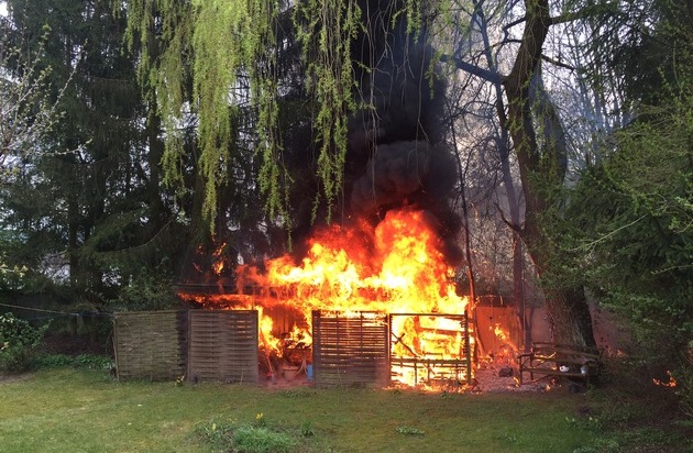 Beim Eintreffen des ersten Löschfahrzeugs brannte eine Gartenhütte und ein Holzstapel in voller Ausdehnung. Das Feuer hatte sich bereits auf einen angrenzenden Baumbestand ausgeweitet und es drohte der Übergriff der Flammen auf mehrere Garagen in unmittelbarer Nähe.