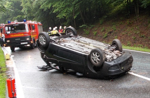 Unmittelbar nach Beendigung des Einsatzes ging in der Einsatzzentrale der Feuerwache ein weiterer Notruf über einen Verkehrsunfall ein. Eine PKW-Fahrerin hatte sich mit ihrem Fahrzeug auf der Jägerhausstraße außerhalb der Ortschaft Zweifall überschlagen. Beim Eintreffen der Kräfte der Löschgruppe Zweifall hatte sich die Fahrerin bereits aus dem auf dem Dach liegenden Auto durch den Kofferraum befreien können. Sie wurde von einem Notarzt vor Ort behandelt und mit einem Rettungswagen in ein nahegelegenes Krankenhaus transportiert. Die Feuerwehr stellte am Einsatzort den Brandschutz sicher und sicherte die Unfallstelle gegen den fließenden Verkehr. Die Reinigung der Fahrbahn wurde von einem Spezialunternehmen durchgeführt.