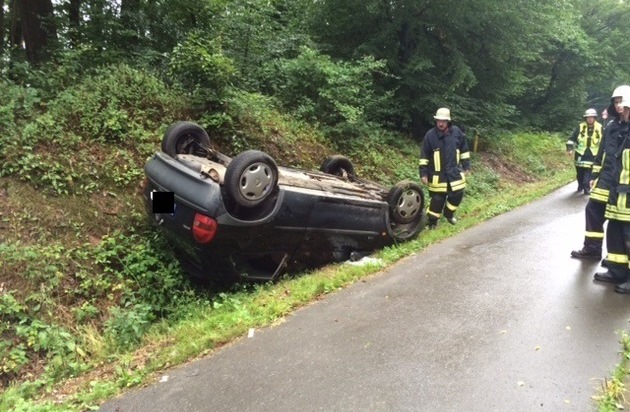 Die ersteintreffenden Feuerwehrkräfte fanden folgende Lage vor: Ein PKW lag auf dem Dach im Graben neben der Straße; Ersthelfer hatten den PKW-Fahrer bereits durch das hintere Seitenfenster aus dem Fahrzeug befreit.