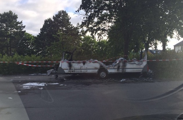 Komplett ausgebrannt ist ein Wohnwagen am frühen Sonntagmorgen auf dem Parkplatz der Schwimmhalle am Elsterweg. Die Einsatzzentrale der Feuer- und Rettungswache der Kupferstadt Stolberg wurde gegen 2.46 Uhr über einen brennenden Wohnwagen auf dem Parkplatz der Schwimmhalle über Notruf informiert. Sofort rückte der Löschzug der Feuerwache unter Leitung von Brandoberinspektor Udo Hermanns zum nahe gelegenen Parkplatz aus. Beim Eintreffen der Einsatzkräfte brannte der Wohnwagen bereits in voller Ausdehnung. Glücklicherweise war der Wohnwagen auf einer Freifläche abgestellt, so dass durch das starke Feuer keine anderen Gebäude oder Fahrzeuge beschädigt wurden. Die zum Wohnwagen gehörende Gasflasche, die eine enorme Gefahr für die Einsatzkräfte bei der starken Wärmebeaufschlagung darstellt, blieb unversehrt. Noch während der Löscharbeiten konnten die Beamten feststellen, dass sich keine Personen im Wohnwagen befanden und niemand verletzt wurde. Nach einer knappen Stunde war das Feuer mit einem C-Rohr und einem Schaumrohr gelöscht.