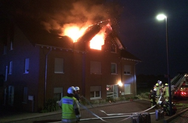 Dramatische Szenen spielten sich am späten Samstagabend bei einem Hausbrand am Wickenweg auf dem Donnerberg ab. Neben hohem Sachschaden wurden dabei zwei Menschen schwer verletzt. Der Einsatzzentrale der Feuer- und Rettungswache Stolberg wurde gegen 22.17 Uhr im ersten Notruf ein Wohnungsbrand in voller Ausdehnung, bei dem sich noch die Bewohner mit Kindern im Haus befinden sollten, gemeldet. Zahlreiche weitere Anrufer meldeten "aus einem Haus/Dach schlagende Flammen" und starken Feuerschein. Aufgrund der detaillierten Notrufe wurden sofort zwei Löschzüge (Feuerwache und 2. Löschzug mit den Löschgruppen Atsch, Büsbach, Donnerberg, Mitte und Münsterbusch), zwei Rettungswagen der Feuerwehr und der Notarzt alarmiert. Wenige Minuten nach dem Notruf trafen die ersten Einsatzkräfte unter Leitung von Amtsleiter Andreas Dovern im Wickenweg ein. Auf der Anfahrt war bereits aus größerer Entfernung Feuerschein und eine große Rauchsäule sichtbar. Daraufhin wurde noch der 5. Löschzug (Gressenich und Werth) zur Unterstützung an die Einsatzstelle beordert und der Grundschutz für das restliche Stadtgebiet von der Feuerwache aus mit dienstfreien Feuerwehrbeamten sichergestellt. Den ersten Kräften bot sich folgende Lage: Vor dem Haus befanden sich zwei schwer verletzte Bewohner die sofort vom Rettungsdienst der Feuerwehr behandelt und anschließend mit dem Notarzt in ein Krankenhaus transportiert wurden. Aus dem freistehenden zweigeschossigen Doppelhaus mit ausgebautem Dachgeschoss schlugen aus der linken Haushälfte bereits die Flammen aus einem Fenster und der Dachhaut. Ein Übergreifen auf die zweite Haushälfte stand kurz bevor. Sofort wurden zwei Trupps unter Atemschutz in die betreffende Wohneinheit zur Menschenrettung und Brandbekämpfung vorgeschickt, die kurze Zeit später von zwei weiteren Trupps unterstützt wurden. Nachdem man sich gewaltsam Zutritt zur Wohnung verschafft hatte, begannen die Such- und Löschmaßnahmen. Zwischenzeitlich stand nach Befragung der Bewohner fest, dass sich die Kinder glücklicherweise nicht im Haus befanden. Um die Brandausbreitung auf das zweite Dachgeschoss zu verhindern, wurde ein weiterer Löschangriff als kontrollierte Riegelstellung mit einem C-Hohlstrahlrohr über die Drehleiter vorgetragen. Damit konnte der Vollbrand des Dachgeschosses des angebauten zweiten Hauses erfolgreich verhindert werden. Ein auf dem Dach verbaute Photovoltaikanlage erschwerte die Löscharbeiten. Nach rund drei Stunden intensivster Löscharbeiten im Innenangriff und von der Drehleiter aus, konnte das Feuer unter Kontrolle gebracht und mit den Nachlöscharbeiten begonnen werden. Bis Sonntagmorgen gegen 8 Uhr verblieb eine Brandwache der Löschgruppe Donnerberg vor Ort, die ständig Brandnachschauen durchführte. Abschließend erfolgte die nochmalige Kontrolle des gesamten Gebäudes mit einer Wärmebildkamera. Zur Versorgung der Einsatzkräfte entsandte die Feuerwehr Eschweiler ihre Komponente Versorgung. Ebenfalls waren die Energieversorger Strom und Gas an der Einsatzstelle, um die Strom- und Gaszufuhr zu unterbrechen.