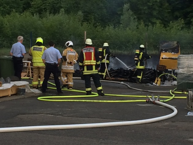 In den Gewerbepark Hamm-Mühle in der Atsch wurde die Feuerwehr der Kupferstadt Stolberg am Pfingstmontag gegen 19 Uhr gerufen. Auf dem Außengelände eines Gewerbebetriebes waren ein größerer Stapel Europaletten und ein fahrbarer Kompressor in Brand geraten. Aufgrund der starken Rauchentwicklung rückten der Löschzug der Feuer- und Rettungswache, die Löschgruppen Atsch, Donnerberg und Mitte sowie der Führungsdienst in das Gewerbegebiet an der Hammstraße aus. Nachdem die Feuerwehrkräfte das Schloss eines großen Tores gewaltsam geöffnet hatten, wurde ein Löschangriff mit zwei Strahlrohren vorgetragen. Nachdem das Feuer soweit unter Kontrolle war, verblieb noch eine Brandwache für eine gute Stunde vor Ort. Noch während der Nachlöscharbeiten der Löschgruppe Atsch wurden die restlichen Einsatzkräfte zu einem weiteren Feuereinsatz zum Lilienweg alarmiert. Hier sollte eine Gasflasche in Brand geraten sein. Beim Eintreffen der ersten Feuerwehrleute auf dem Donnerberg war die Gasflasche bereits von Anwohnern gelöscht worden. Eine Betroffene wurde ambulant vom Rettungsdienst betreut.