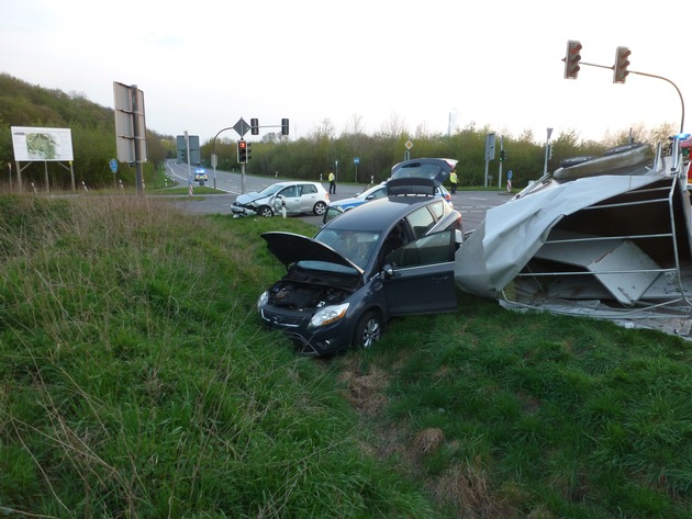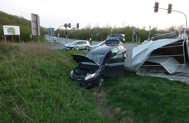 Am heutigen Donnerstagabend ereignete sich im Kreuzungsbereich Brinkstraße / Schloßstraße ein Verkehrsunfall zwischen einem PKW und einem PKW-Pferdeanhänger-Gespann. Durch den Zusammenprall wurde einer der PKW gegen einen Laternenpfahl geschleudert und das Anhängergespann rutschte in den Straßengraben. Hierbei kippte der Pferdeanhänger auf die Seite. Das Pferd im Anhänger konnte leicht verletzt durch Passanten befreit werden. Nach tierärztlicher Untersuchung konnte das Tier in einen anderen Anhänger geführt werden. Personen kamen nicht zu Schaden. Es entstand erheblicher Sachschaden an beiden Fahrzeugen. Die Feuerwehr unterstützte bei den Rettungsmaßnahmen. An beiden Fahrzeugen wurden aus Sicherheitsgründen die Batterien abgeklemmt.