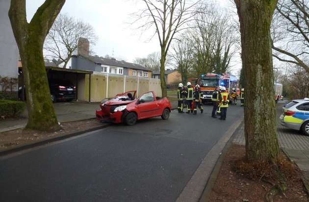 Um 14:24 Uhr wurde heute die Feuerwehr und der Rettungsdienst zu einem Verkehrsunfall mit eingeklemmter Person auf der Knappenstr. alarmiert. An der Einsatzstelle fanden die Einsatzkräfte ein Fahrzeug vor einen Baum vor. Im Fahrzeug befand sich eine verletzte Person, die aber nicht eingeklemmt war. Die Einsatzstelle wurde gesichert und der Brandschutz sichergestellt. Die verletzte Person wurde im Fahrzeug vom Notarzt medizinisch versorgt und von der Feuerwehr schonend befreit. Dazu wurde das Dach mit techn. Gerät entfernt. Anschließend wurde die verletzte Person mit einen Rettungswagen in ein Dinslakener Krankenhaus transportiert. Gegen 15:30 Uhr war der Einsatz beendet. Eingesetzte Einheiten: Hauptwache, Stadtmitte und der Rettungsdienst.