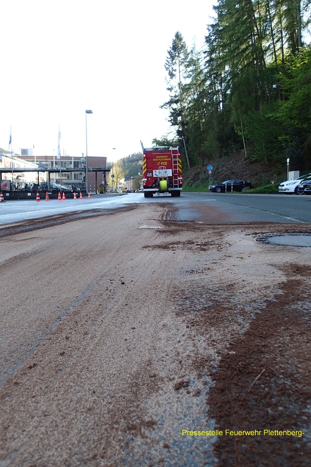 FW-PL: LKW verliert in Plettenberg aus undichtem Tankdeckel Dieselkraftstoff. Hauptwache, Löschgruppe Stadtmitte und Löschgruppe Ohle im Einsatz