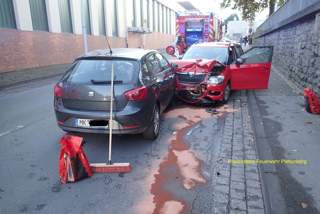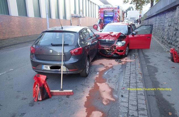 Zu einem schweren Verkehrsunfall mit 3 beteiligten Fahrzeugen kam es gestern Abend gegen 19:20 Uhr auf der Herscheider Straße im Ortsteil Holthausen. Aus bisher ungeklärter Ursache kam der Fahrer eines Skoda Fabia in Fahrtrichtung Plettenberg nach rechts in Höhe der Fa. Mendritzki von der Fahrbahn ab, überfuhr mehrere Begrenzungspfähle und prallte gegen die Mauer der Fa. Kampwerke, stieß dann im Einmündungsbereich zur Holbeinstraße mit einem Opel Tigra zusammen und prallte frontal in Höhe der Bushaltestelle mit einem Seat Ibiza zusammen. Ein zufällig vorbeikommender Arzt leistete bis zum Eintreffen von Feuerwehr und Rettungsdienst erste Hilfe. Insgesamt wurden eine Person schwer, 2 weitere Personen leicht verletzt ins Krankenhaus eingeliefert. Neben den beiden Rettungswagen aus Plettenberg kam auch ein Rettungswagen aus Werdohl zum Einsatz. Die Feuerwehr sicherte die Unfallstelle ab und nahm ausgelaufene Betriebsmittel auf. Für die Dauer der Rettungsarbeiten war die Herscheider Straße teilweise komplett gesperrt. Zur Schadenshöhe und Unfallursache kann die Feuerwehr keine Angaben machen.