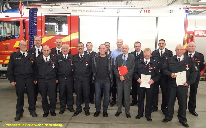 Am vergangenen Freitag wurden verdiente Feuerwehrkräfte im Rahmen einer Feierstunde, an der rund 50 Personen teilnahmen, in der Feuer-und Rettungswache am Wall geehrt. Bürgermeister Ulrich Schulte begrüßte die Jubilare und alle Anwesenden, unter anderem Fachbereichsleiter Herrn Hans-Peter Kapitain, den zuständigen Fachgebietsleiter für Brandschutz und Rettungswesen Thorsten Spiegel, den Kreisbrandmeister Rainer Blumenrath, den 1. Vorsitzenden des Feuerwehrverbandes Märkischer Kreis Herrn Georg Würth, die anwesenden Notfallseelsorger, sowie die Wehrleitung und Führungskräfte der Plettenberger Feuerwehr. Zunächst bedankte sich der Bürgermeister bei allen haupt- und ehrenamtlichen Kräften der Plettenberger Feuerwehr für ihre geleistete Arbeit und gab einen Rückblick auf das vergangene Jahr. Wie schnell die Feuerwehr auf der Straße ist, um ihren Bürgern unverzüglich Hilfe zu leisten, davon konnten sich die Anwesenden selbst überzeugen. Noch in den ersten Sätzen der Begrüßungsrede des Bürgermeisters ertönte der Alarmgong in der Feuerwache und haupt- und ehrenamtliche Kräfte rückten gemeinsam zu einem Brand im Industriegebiet aus. Insgesamt unruhig verlief der Abend während der Jubilarehrung für die Einsatzkräfte in der Feuerwache, so waren auch die beiden Rettungswagen,Notarzteinsatzfahrzeug und in einem Fall sogar die Brandschutzbesatzung mehrfach zu medizinischen Notfällen ausgerückt. Insgesamt 3591 Gesamteinsätze in Brandschutz, in der Hilfeleistung und Rettungsdienst inklusive Notarzteinsätzen absolvierten haupt-und ehrenamtliche Kräfte der Plettenberger Feuerwehr gemeinsam im Zeitraum eines Jahres. Der Leiter der Feuerwehr Markus Bauckhage, dessen Stellvertreter Markus Hüsken und Frank Hinkelmann, sowie der Bürgermeister übernahmen die Ehrungen der verdienten Feuerwehrkräfte. Besonders geehrt wurde für seine 75-jährige Mitgliedschaft in der Feuerwehr Plettenberg Herr Karl-Heinz Hoffmeister von der Löschgruppe Ohle.Für 35-jährige Mitgliedschaft und somit Auszeichnungen mit dem Feuerwehrehrenabzeichen in Gold wurden geehrt: Frank Hinkelmann (stellv. Leiter der Feuerwehr), Peter Tillmann (LG Eiringhausen), Matthias Vorderstemann und Hans-Jürgen Müller (LG Holthausen), Dirk Neumann (LG Ohle) und Lothar Marienfeld (Leiter des Spielmannszuges).Für 25 jährige Mitgliedschaft und somit Auszeichnungen mit dem Feuerwehrehrenabzeichen in Silber wurden geehrt: Martin Kalthoff (LG Selscheid), Mario Petersen (LG Holthausen), Lars Marienfeld (Spielmannszug), sowie Malte Reiß und Bernd Langenbach (beide LG Stadtmitte).In die Alters- und Ehrenabteilung wurde Jürgen Kaiser von der Löschgruppe Holthausen versetzt.
