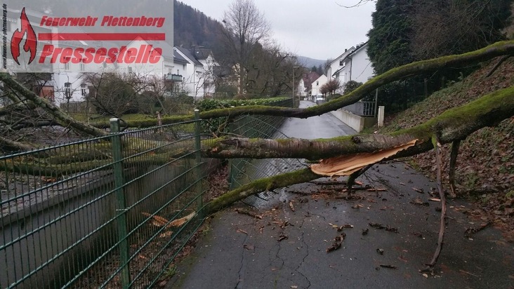 Am heutigen Sonntagmorgen kurz vor 08:00 Uhr fiel ein Baum aus einer Uferböschung auf die Weidenstraße sowie eine angrenzende Garage und eine Zaunanlage. Die hauptamtliche Wachbereitschaft der Plettenberger Feuerwehr rückte aus und beseitigte den Baum mit Hilfe einer Motorsäge. Zum Glück waren weder Fahrzeuge noch Fußgänger auf dem kombinierten Fahr- und Fußweg unterwegs, weshalb niemand verletzt wurde. Zur Höhe des entstandenen Sachschadens kann die Feuerwehr keine Auskunft erteilen.