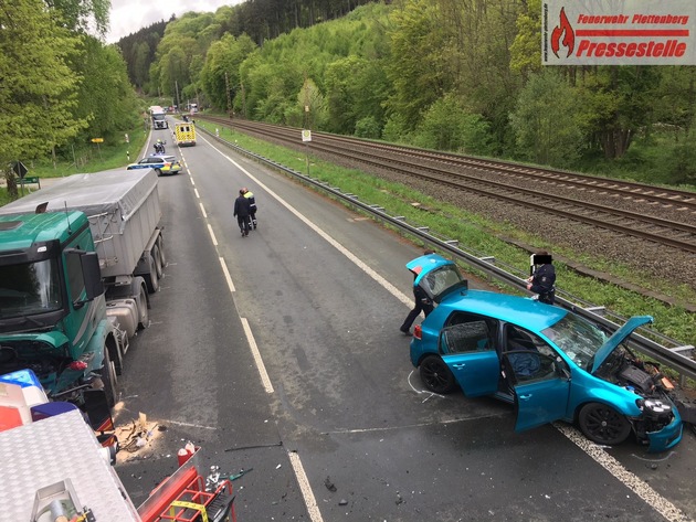 Kurz nach 09:00 Uhr ist es am heutigen Montagmorgen im Plettenberger Ortsteil Ohle auf der B 236 zu einem schweren Verkehrsunfall gekommen. Ein PKW, aus Plettenberg kommend in Richtung Werdohl fahrend, ist aus noch nicht genau geklärter Ursache etwa in Höhe der Einmündung Elhausen offenbar von seiner Fahrspur abgekommen und im Gegenverkehr frontal mit einem LKW-Sattelzug kollidiert. Dabei wurde der PKW herumgeschleudert und kam völlig demoliert in einer Leitplanke zum Stehen. Kurz nach 09:00 Uhr wurde die Plettenberger Feuerwehr mit den Einheiten Feuer- und Rettungswache, Eiringhausen sowie dem Rüstzug Ohle mit dem Stichwort "eingeklemmte Person" alarmiert. Zum Zeitpunkt des Unfalles waren bereits beide Rettungswagen der Plettenberger Feuerwehr in Paralleleinsätzen gebunden, weshalb der Plettenberger Notarzt und ein Rettungswagen aus Werdohl alarmiert wurden. Vor Ort angekommen stellten die Rettungskräfte fest, dass ein 21-jähriger Autofahrer in seinem Fahrzeug eingeschlossen war, zum Glück jedoch nicht eingeklemmt. Er musste nach rettungsdienstlicher Erstversorgung patientenschonend mit schwerem hydraulischem Rettungsgerät aus seinem Fahrzeug befreit werden und wurde anschließend mit dem Verdacht auf schwere Verletzungen per Rettungswagen dem Plettenberger Krankenhaus zugeführt. Der LKW-Fahrer blieb bei der Kollision unverletzt. Die Bundesstraße 236 blieb während der Rettungs- und Bergungsarbeiten sowie zur Unfallaufnahme durch die Polizei voll gesperrt. Zur genauen Unfallursache und Höhe des entstandenen Sachschadens kann die Feuerwehr keine Auskunft erteilen. Die B 236 ist aktuell halbseitig wieder befahrbar.
