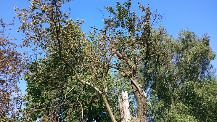 Tatsächlich handelte es sich um das private Verbrennen alten (Bau-)Holzes, das beim Eintreffen der Feuerwehr auch bereits deutlich kleiner war, als die Zeugen berichteten. Eine angesengte Hecke und die vertrockneten Blätter eines benachbarten Baumes sprachen jedoch eine deutliche Sprache. Auch eine Außentemperatur von deutlich über 30 ° C, aktuelle Hitzewarnungen und die mit Stufe 4 zweithöchsten Stufe des Waldbrandindex ließen den Betreiber unbeeindruckt. Die Feuerwehr löschte das Feuer mit dem Schnellangriff eines Löschgruppenfahrzeugs, kontrollierte die betroffene Hecke und den Baum mit einer Wärmebildkamera und berieselte sicherheitshalber die Umgebung, bevor die Einsatzstelle an die Polizei übergeben wurde.