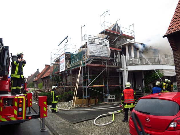 Am Donnerstagmorgen um 07:58Uhr wurde der Löschzug 1 Stadt Mitte sowie der Löschzug 3 Stockum der Freiwilligen Feuerwehr Werne mit dem Stichwort "Feuer_3 Küchenbrand" in die Ludgeristraße nach Werne gerufen. Bereits auf der Anfahrt zur Einsatzstelle war eine starke Rauchentwicklung von weitem sichtbar. Vorort arbeitende Dachdecker hatten eine Rauchentwicklung im Obergeschoss wahrgenommen und die Feuerwehr alarmiert. Aufgrund der frühen Erkennung des Brandes, konnten sich alle Personen frühzeitig in Sicherheit bringen. Aufgrund der starken Hitzeentwicklung platzten bei Eintreffen der ersten Rettungskräfte bereits die Glasscheiben einer angrenzenden Terrassentür im Obergeschoss und Flammen schlugen aus dem Gebäude. Der zuerst eintreffende Einsatzleiter erkundete die vorgefundene Lage und leitete einen Innenangriff von mehreren Trupps unter Atemschutz im hinteren Teil des Obergeschosses ein. Diese Trupps gingen unter schwerem Atemschutz über die Steckleiter sowie über das Treppenhaus ins Obergeschoss vor und bekämpften mit 3 Hohlstrahlrohren den Brand im Küchenbereich. Ein Trupp löschte von außen über die Drehleiter durchschlagende Flammen die aus der offenen Dachhaut austraten. Mit mehreren Trupps im Innenangriff konnte ein Übergreifen der Flammen auf angrenzende Gebäudeteile verhindert werden. Mit Hilfe der eingesetzten Wärmebildkameras konnten auch die letzten Glutnester in Zwischendecken gefunden und gelöscht werden. Aufgrund der starken Rauchentwicklung und der hohen Temperaturen des Brandrauches die bei Bränden entstehen, ist die komplette obere Etage stark in Mitleidenschaft gezogen worden. Die Feuerwehr führte nach der Brandbekämpfung noch ausgiebige Lüftungsmaßnahmen am Objekt durch. Aufgrund der Hitze sind Wasserleitungen geborstene und es trat Wasser aus. Daraufhin sperrten die freiwilligen Kräfte der Feuerwehr im Hauswirtschaftsraum das Wasser im Gebäude ab. Nach kurzer Zeit konnte der Leitstelle "Feuer unter Kontrolle" gemeldet werden. Die Nachlösch- und Aufräumarbeiten zogen sich jedoch noch bis circa 10Uhr hin. Die Ludgeristraße war für die Einsatzdauer komplett gesperrt. Im Einsatz waren 35 freiwillige Kräfte der Freiwilligen Feuerwehr Werne mit 7 Fahrzeugen, der Rettungsdienst Werne sowie die Polizei.