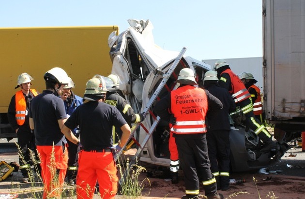 Bereits während die ersten Fahrzeuge des Löschzuges 1 aus Werne die Einsatzstelle in Richtung Gerätehaus Werne verlassen hatten, wurde der Einsatzleiter durch die Leitstelle über einen weiteren Unfall im Rückstau auf der A1 in Höhe der Auffahrt Werne in Fahrtrichtung Köln informiert. Aufgrund der Einsatzmeldung dass sich eine eingeklemmte Person noch im verunfallten Fahrzeug befindet, wurde zusätzlich die Berufsfeuerwehr Hamm sowie ein Löschzug der Freiwilligen Feuerwehr Hamm aus Sandbochum durch die Leitstelle zum Einsatzort alarmiert. Die zuerst eintreffenden Kräfte aus Werne führten eine erste Erkundung durch. Ein LKW hatte einen Kleintransporter auf das stehende Stauende geschoben. Eine schwerstverletzte Person die massiv in Ihrem Fahrzeug eingeklemmt war, wurde bei Eintreffen der Kräfte bereits durch den Rettungsdienst betreut. Die freiwilligen Kräfte der Feuerwehr Werne stellten über das Löschfahrzeug aufgrund des auslaufenden Betriebsmittel und der Gefahr eines Brandausbruches einen zweifachen Brandschutz sicher. Die Kräfte des Rüstwagens bauten eine Geräteablage für die Hydraulischen Rettungsgeräte sowie die weiteren benötigten Werkzeuge auf. Nach Rücksprache mit dem Notarzt und dem Rettungsdienst wurde sich aufgrund der schweren Verletzungen des eingeklemmten Fahrers zu einer Sofortrettung entschieden. Der kurz nach der Feuerwehr Werne eintreffende Rüstzug der Berufsfeuerwehr Hamm begann in Absprache mit dem Werner Einsatzleiter parallel von der anderen stark verformten Seite des Kleintransporters mit dem hydraulischen Rettungsgerät die Arbeiten um den schwerst eingeklemmten Fahrer zu befreien. Es wurden zwei Einsatzabschnitte gebildet. Der eintreffende Leiter des Rettungsdienstes organisierte die unterschiedlichen Rettungsmittel mit denen die leicht verletzten Unfallteilnehmer und ein unter Schock stehender Ersthelfer bzw. Zeugen in umliegende Krankenhäuser transportiert wurden. Nach circa einer Stunde konnte die eingeklemmte Person an den Rettungsdienst übergeben werden. Die Aufräumarbeiten laufen aktuerll, beide Fahrspuren in Richtung Köln sind derzeit noch gesperrt.