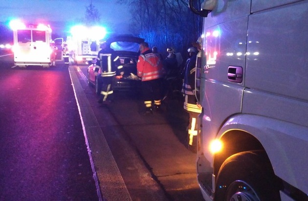 Um 06:34 Uhr am Donnerstagmorgen wurde per digitalem Meldeempfänger der Löschzug 1 der Freiwilligen Feuerwehr Werne mit dem Stichwort " TH_PERSON_KLEMMT - LKW gegen PKW unklar Eingeklemmt" auf die Bundesautobahn 1 in Fahrtrichtung Köln alarmiert. Circa 1200 Meter hinter der Auffahrt Hamm / Bockum Werne kam es im morgendlichen Berufsverkehr zu einer Kollision zwischen zwei PKW und einem LKW. Beim Eintreffen der ersten Kräfte stellte sich entgegen der Alarmierung Glücklicherweise heraus, dass keine Person im Fahrzeug eingeklemmt war. Die Beifahrerin des PKW wurde bei dem Unfall leicht verletzt und wurde durch den Rettungsdienst bereits betreut.