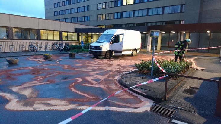 Um 5:44 Uhr wurde der Löschzug 1 erneut alarmiert. Aus Unachtsamkeit hatte der Fahrer eines Lieferwagens einen Blumenkübel übersehen und die Ölwanne am Fahrzeug beschädigt. Im Zufahrtsbereich des Werner Krankenhauses kam es beim Rangieren zu einer großflächigen Verschmutzung mit Motoröl. Die eintreffende Feuerwehr sicherte zunächst die Gullys gegen das Einlaufen des Motoröls und streute die Fläche mit Bindemittel ab, um eine weitere Ausbreitung zu verhindern. Da es sich um ein Privatgelände handelt, wurde die Fläche danach abgesperrt und dem Betreiber übergeben. Der sorgte in der Folge für die Reinigung der Fläche durch ein Spezialunternehmen. Der beschädigte Transporter musste abgeschleppt werden. Dieser Einsatz endete mit der Übergabe an den Betreiber gegen 6:20 Uhr, wonach die 12 Einsatzkräfte sich wieder auf den Weg zu ihren Arbeitsstätten machen konnten.