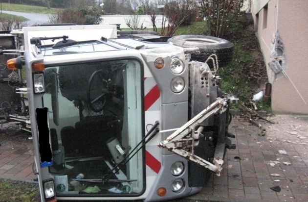 Als heute Morgen gegen 08:35 Uhr ein 53-jähriger Fahrer eines kleinen Spezial-LKW für Wechselaufbauten im Mauritiusring nach getaner Arbeit wieder zu seinem kurzzeitig abgestellten LKW gehen wollte, war dieser verschwunden. Weil er nicht ausreichend gegen Wegrollen gesichert war, machte sich das ca. 6 Tonnen schwere Gefährt selbständig und rollte die abschüssige Straße hinab. Im Mauritiusring stieß der Klein-LKW zunächst noch gegen einen geparkten Audi und eine Straßenlaterne bevor er in der Kirchhofstraße nach Durchquerung eines Vorgartens gegen die Hausecke eines Anwesens prallte und dabei umstürzte. Glücklicherweise wurde bei dem Unfall niemand verletzt. Der entstandene Sachschaden beläuft sich auf ca. 10.000 Euro.