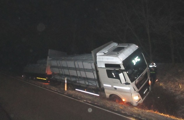 Am heutigen Montagmorgen gg. 04.20 Uhr ist es auf der B 270 in Waldfischbach-Burgalben zu einem Unfall mit einem Lkw gekommen. Der 62 Jahre alte Fahrer war mit seinem etwa 35 Tonnen schweren Gespann aus Richtung Pirmasens kommend in Richtung Kaiserslautern unterwegs gewesen. Zwischen den Abfahrten Waldfischbach Süd und Nord war ihm dann unvermittelt ein Reh auf die Fahrbahn gesprungen. Der Fahrer erschrak und versuchte auszuweichen. Hierbei schleuderte er dann auf die Gegenfahrbahn und fuhr dort in den Böschungsgraben. Das Zugfahrzeug des Gespanns neigte sich dabei um etwa 30 Grad und drohte umzukippen. Der Fahrer konnte schließlich durch die eingesetzten Rettungskräfte unverletzt aus seinem Fahrzeug geborgen werden. Im Anschluss konnte das Fahrzeug durch 2 Kräne stabilisiert und schließlich geborgen werden. Hierzu wurde die B 270 für 2 1/2 Stunden voll gesperrt. Der Gesamtschaden beläuft sich auf etwa 2000.- Euro.