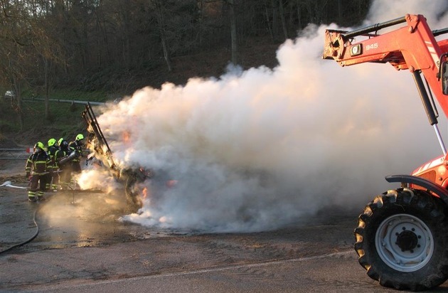 Zwischen Maßweiler und Thaleischweiler-Fröschen in Höhe der Faustermühle brannte am Donnerstagnachmittag ein landwirtschaftlicher Anhänger. Der Anhänger war beladen mit 17 großen Strohballen. Wie der Besitzer mitteilte, war er mit seinem Traktor und der Ladung unterwegs nach Thaleischweiler-Fröschen, als er plötzlich Rauch aus dem Stroh aufsteigen sah. Glücklicherweise konnte er das Gespann auf ein an die Straße angrenzendes Wiesengrundstück lenken und die Zugmaschine abhängen, so dass zumindest diese vom Feuer unversehrt blieb. Feuerwehren aus Thaleischweiler-Fröschen, Rieschweiler-Mühlbach und Wallhalben waren kurze Zeit nach der Brandmeldung mit 7 Einsatzfahrzeugen und 30 Kräften vor Ort. Sie brauchten zur Löschung des Brandes mehrere Stunden. So war auch die Landstraße für 2 Stunden für den Durchgangsverkehr gesperrt. Wie vom Eigentümer zu erfahren war, entstand ein Schaden in Höhe von ca. 4000.- Euro. Verletzt wurde niemand.