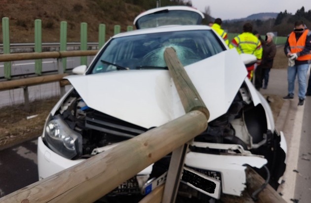 Am Donnerstagmittag, gegen 12:38 Uhr, fuhr ein weißer VW Golf auf der Kreisstraße von Münchweiler kommend in Richtung Ständenhof. Etwa 300 Meter vor der Tankstelle in einer Linkskurve kam dem Fahrer plötzlich ein anderes Fahrzeug auf der eigenen Fahrspur entgegen. Der Golffahrer konnte nur noch nach rechts ausweichen und kollidierte frontal mit der seitlichen hölzernen Schutzplanke. Hierbei bohrte sich die obere Holzstange in die Windschutzscheibe. Der Fahrer verletzte sich nur geringfügig durch Glassplitter. Ohne sich um den Unfall zu kümmern fuhr der Verursacher weiter. Bei dessen Fahrzeug soll es sich um einen weißen Kleinwagen handeln. Der VW Golf wurde stark beschädigt und musste abgeschleppt werden. Die Polizei bittet um weitere Zeugenhinweise.