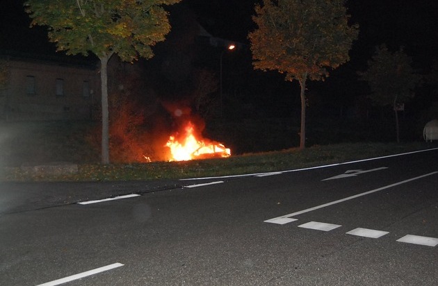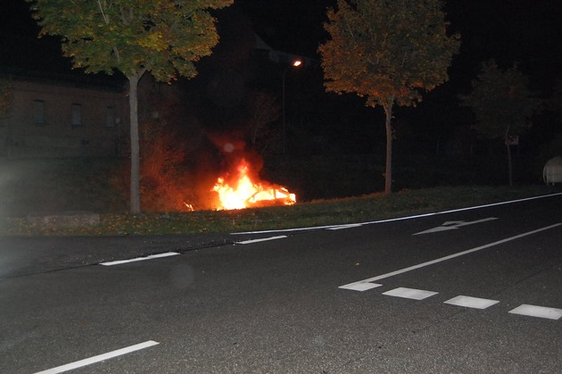 Ein PKW ist am Freitagmorgen von der Bundesstraße 270 abgekommen. Das Fahrzeug ging in Flammen auf und brannte völlig aus. Ein Mann flüchtete von der Unfallstelle. Anwohner informierten die Polizei um 05:50 Uhr über den Unfall. Beim Eintreffen von Polizei und Feuerwehr befand sich niemand mehr im Wagen. Zeugen hatten einen Mann über die Hauptstraße in Richtung Mühlacker davonlaufen sehen. Die Suche nach dieser Person verlief im Weiteren erfolglos. Ob es der 29-jährige Fahrzeug-Besitzer war, ist noch nicht gesichert. Auf Grund der vorgefundenen Spuren gehen die Ermittler davon aus, dass der blaue Opel Corsa mit KL - Kennzeichen auf der B 270 aus Richtung Kaiserslautern kommend Lohnweiler erreichte. Aus bislang noch ungeklärter Ursache kam das Fahrzeug in Höhe der Bushaltestelle nach rechts von der Fahrbahn ab. Der Wagen stieß zunächst gegen einen Baum, welcher durch den Aufprall entwurzelt wurde und durchbrach. Anschließend flog der Pkw über eine Treppe an der Brücke hinweg, wodurch vermutlich die Benzinleitung riss. Nach weiteren 47 Metern, an der Böschung entlang rutschend, blieb der Opel schließlich stehen. Hinweise zu dem flüchtenden Mann und zum Unfall selbst sowie gegebenenfalls zu der Fahrt über die B 270 in Richtung Lohnweiler bitte an die Polizei in Lauterecken unter Telefon-Nummer 06382 911 0.