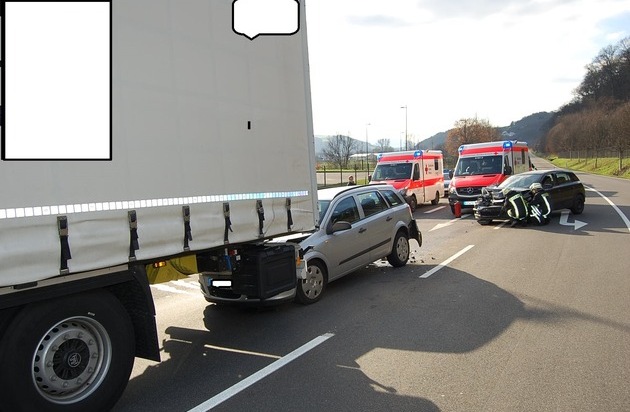 Auf der B 420 ist ein 54-jähriger PKW-Fahrer mit seinem Wagen auf zwei bereits an der Ampel stehende Fahrzeuge aufgefahren. Bei der Karambolage wurden am Donnerstagmittag insgesamt fünf Personen leicht verletzt. Ein PKW stand bereits bei Rotlicht hinter einem Sattelschlepper mit Auflieger. Aus noch ungeklärter Ursache stieß der 54-Jährige mit seiner rechten Fahrzeugfront gegen das linke hintere Eck des vor ihm befindlichen PKW. Durch die Wucht des Aufpralls wurde dieser Wagen auf den Sattelauflieger geschoben. Bis auf den ebenfalls leicht verletzten LKW-Fahrer wurden alle Betroffenen zur gesundheitlichen Überprüfung ins Krankenhaus gebracht. Dies waren die beiden PKW-Fahrer und zwei Mitfahrer aus dem bereits gestoppten Fahrzeug. Die beiden PKW mussten abgeschleppt werden. Der Gesamtschaden wird auf 14.000 Euro geschätzt. Die Feuerwehren Lauterecken und Medard waren mit 12 Kräften im Einsatz. Die Teams von zwei Rettungsfahrzeugen kümmerten sich um die Verletzten.
