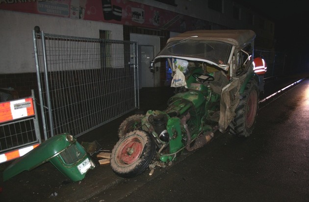 Das hätte schlimmer ausgehen können! Einem Fußgänger war am frühen Dienstagmorgen eine PKW-Fahrerin über den Fuß gefahren. Einen Traktor hat sie beim anschließenden Zusammenstoß zerlegt. In der Hauptstraße / B 420 wollte ein Traktorfahrer seinen Hänger rückwärts auf ein Anwesen neben der Straße fahren. Hierzu ließ er sich von einem mit einer Warnweste bekleideten Mann einweisen. Seine Warnblinkanlage war eingeschaltet. Die Unfallverursacherin gab an, dass sie gerade ihre beschlagene Frontscheibe putzte und dabei das Hindernis übersah. Der PKW fuhr dem Traktor in die Seite da dieser zum Zeitpunkt der Kollision schräg zur Fahrbahn stand. Sie riss die Verkleidung und die Radaufhängung des Schleppers ab. Der einweisende Fußgänger gab an, dass der PKW über seinen Schuh gefahren war. Er hatte allerdings keine Verletzungen davon getragen. Ein Abschleppdienst musste sich beider Fahrzeuge annehmen.