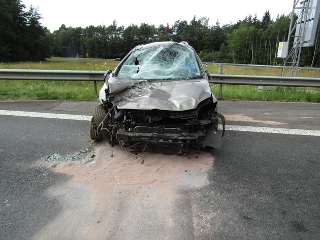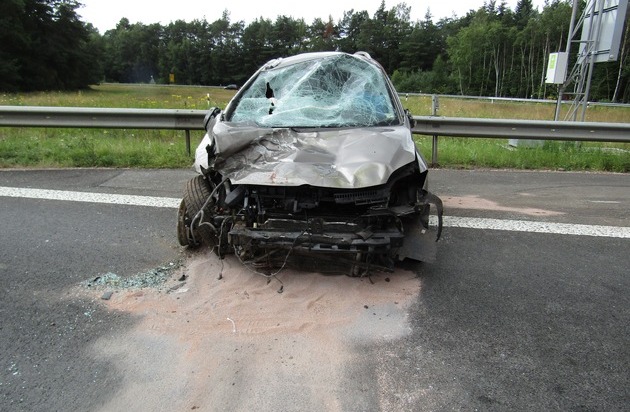 Zum Verlassen der Autobahn 6 befuhr eine 49-jährige Autofahrerin aus dem hessischen Raum am Samstag, den 23.07.2016, gegen 16 Uhr die Ausfahrt der Anschlussstelle KL-Einsiedlerhof. Im nach rechts verlaufenden Kurvenbereich kam sie nach links von der Fahrbahn ab und setzte auf der dort verlaufenden ansteigenden Schutzplanke auf, was ihrem PkW katapultartig einen Aufschub nach oben verschaffte. Infolgedessen drehte sich das Fahrzeug unter Beschädigung mehrerer Verkehrszeichen und Abreißen der Notrufsäule insgesamt 4 mal bis es zum Erliegen kam. Die Unfallverursacherin und ihre Beifahrerin konnten das Fahrzeug unter Hilfestellung der Berufsfeuerwehr Kaiserslautern jedoch leicht verletzt verlassen und wurden zur Untersuchung ins Krankenhaus verbracht. Der Gesamtschaden beträgt ca. 15000 Euro.