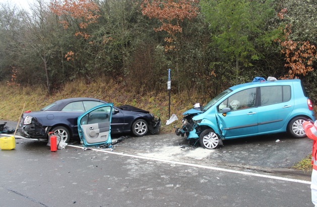 Zwischen Reipoltskirchen und Hefersweiler kam es am Mittwochmorgen zu einem schweren Verkehrsunfall. Ein 54-Jähriger befuhr mit seinem Mercedes Personenwagen die Landstraße 382 in Richtung Hefersweiler, als er einen vorausfahrenden Lastwagen überholte. Während des Überholvorgangs kam ein Minivan aus entgegengesetzter Richtung. Es kam zum Frontalzusammenstoß beider Fahrzeuge. Der ältere Fahrer des Minivan sowie dessen Ehefrau auf dem Beifahrersitz wurden schwer verletzt ins Krankenhaus verbracht. Der Mercedes-Fahrer sowie dessen Vater als Mitfahrer wurden ebenfalls zwecks Versorgung in ein Klinikum gefahren, wobei die Schwere der Verletzungen noch unbekannt ist. An beiden Fahrzeugen entstand wirtschaftlicher Totalschaden, der Lastwagen wurde leicht beschädigt. Der Rettungsdienst befand sich mit vier Fahrzeugen sowie Notärzten im Einsatz, die umliegenden Feuerwehren mit fünf Fahrzeugen und dreißig Einsatzkräften.