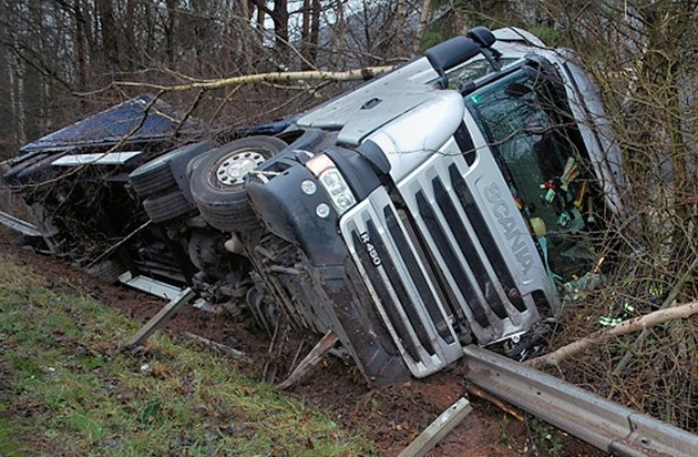 Am Mittwochmittag gegen 14 Uhr fuhr der Sattelschlepper die B 10 von Pirmasens in Richtung Landau. Kurz hinter Wilgartswiesen kam dieser aus noch ungeklärter Ursache nach links von der Fahrbahn ab. Der Lkw kippte in die Böschung und blieb dort schräg auf der Schutzplanke liegen.
