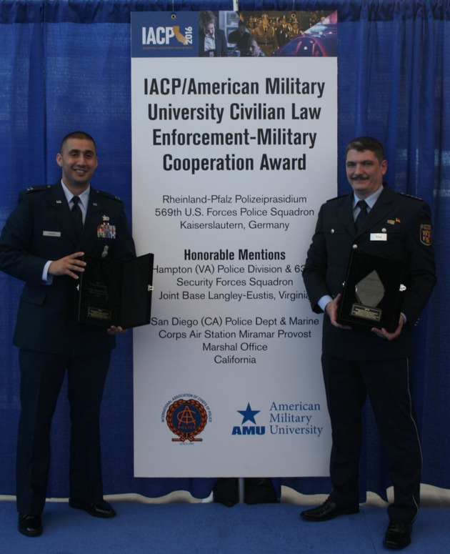 Eine ganz besondere Ehre wurde dem Polizeipräsidium Westpfalz zuteil. Die 569th U.S. Forces Police Squadron und die westpfälzische Polizei wurden von der "International Association of Chiefs of Police" (IACP) für ihre hervorragende Zusammenarbeit ausgezeichnet. Zusammen mit dem Operations Officer der 569th U.S. Forces Police Squadron, Captain John-Paul Adrian, durfte Polizeihauptkommissar Simon Mai von der Polizeiinspektion Kaiserslautern 1 den Award auf der diesjährigen IACP-Konferenz in der vergangenen Woche in San Diego/Kalifornien entgegennehmen. Erstmals in der langjährigen Geschichte der IACP wurde hierbei eine deutsche Behörde ausgezeichnet. Das "Civil Law Enforcement Military Cooperation Comitee" (CLEMCC), also das Komitee über die Zusammenarbeit zwischen zivilen und militärischen Polizeibehörden, musste eine Vielzahl von Bewerbungen sichten und bewerten, wobei es durch die American Military University unterstützt wurde. Ausschlaggebend für das CLEMCC war dabei nicht nur die Anzahl von gemeinsam aufgenommenen oder bearbeiteten Verkehrsunfällen und Strafanzeigen. Vielmehr dürfte die langjährige und vertrauensvolle Zusammenarbeit, welche sich in vielen gemeinsamen Aktionen zwischen dem Polizeipräsidium und der hiesigen US-Militärpolizei ausdrückt, entscheidend gewesen sein. Beispielsweise seien die gemeinsamen Fußstreifen in der Kaiserslauterer Altstadt sowie die gemeinsamen Streifen auf diversen Volksfesten genannt. Die IACP wurde 1893 in den Vereinigten Staaten gegründet und ist auch heute noch sehr stark US-amerikanisch geprägt. Dort ist sie auch erste Adresse und absolute Kompetenz in Fortbildungsfragen, insbesondere wenn es um die Fortbildung von Führungskräften geht. In den vergangenen Jahren wuchs sie auf knapp 29.000 Mitglieder aus über 120 Staaten. Sie veranstaltet einmal jährlich eine internationale Konferenz von Dienststellenleitern, verbunden mit einer der größten Messen für Polizeiausrüstung auf dem nordamerikanischen Markt. Die diesjährige Veranstaltung fand vom 15. bis zum 18. Oktober in San Diego/Kalifornien statt. Knapp 17.000 Teilnehmer aus über 80 Staaten besuchten die Messe. Zudem wurden über 200 Workshops zu den verschiedensten aktuellen polizeilichen Themen abgehalten. Simon Mai konnte an mehreren dieser Workshops teilnehmen und hierbei feststellen, dass aktuell bei uns in Rheinland-Pfalz präsente Themen weltweit auch andere Polizeibehörden beschäftigen oder im Fokus der Öffentlichkeit stehen. Als Beispiele seien Gewalt in engen sozialen Beziehungen, der Einsatz von Bodycams, der Einsatz und das Training von nichttödlichen Waffen (Stichwort Taser), generelle Eigensicherungsfragen sowie gesundheitliche Aspekte (vergleichbar mit unserem BGM) genannt. Während die gut besuchten Workshops von Impulsvorträgen im "best-practice"-Sinn ("Lernen vom Besten") geprägt waren, gab es im Anschluss und bei diversen informellen Veranstaltungen ausgiebig Gelegenheit zum Austausch mit Kollegen aus aller Welt.