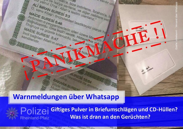 Die Welle schlug in der Südpfalz auf, erreichte dann auch die Westpfalz und den Raum Mainz. Bei einigen Polizeidienststellen gingen Anrufe besorgter Menschen ein, die solche "Warnungen" erhalten hatten, zum Teil als reine Textmeldung, manche mit Bild, einige sogar begleitet von einer Audiodatei, bei der eine weibliche Stimme davor warnt, diese Post aus dem Briefkasten zu holen. Es wird sogar behauptet, dass bereits Personen, die das Pulver eingeatmet haben, in Krankenhäuser gebracht worden seien. - Die Quelle dieser Behauptungen bleibt allerdings überall unklar.
