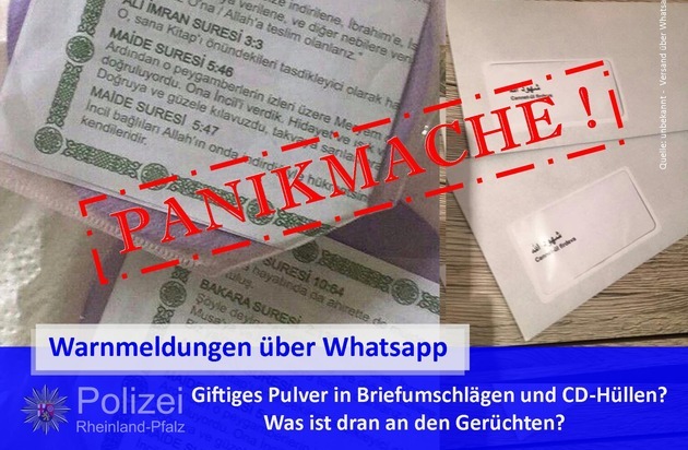FAKT ist: Bei der Polizei Rheinland-Pfalz sind bislang KEINE Fälle bekannt, die diese Gerüchte auch nur ansatzweise bestätigen würden. Stattdessen zeigen Nachfragen in anderen Bundesländern: Auch die Polizeien in Nordrhein-Westfalen, Baden-Württemberg und Sachsen haben diese Warnmeldungswelle bereits erlebt. In Köln brachten besorgte Bürger sogar CDs zur Untersuchung zur Polizei. Und auch dort: KEIN GIFT - KEINE VERLETZTEN! Auf den CDs waren lediglich Verse aus dem Koran zu hören.