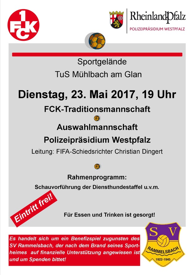 Auch in diesem Jahr treffen die Mannschaften des Polizeipräsidiums Westpfalz und der FCK-Oldies nach Abschluss der Saison aufeinander. Das Match findet am Dienstag, 23. Mai 2017, 19 Uhr, auf dem Sportgelände des TuS Mühlbach am Glan statt und gilt als Benefizspiel zugunsten des SV Rammelsbach, der nach dem Brand seines Sportheimes auf finanzielle Unterstützung angewiesen ist und um Spenden bittet. Der Eintritt ist frei. Bereits seit zehn Jahren kommt es zum Aufeinandertreffen der FCK-Altstars und den Ordnungshütern. Mit dieser Geste bedankt sich der FCK bei der Polizei für die geleistete Arbeit bei den Heimspielen. Allerdings konnten die Polizisten erst im vergangenen Jahr zum ersten Mal gegen die ehemaligen Profis gewinnen. Auch in diesem Jahr werden auf Seiten der "Roten Teufel" wieder einige Deutsche Meister und Pokalsieger zum Einsatz kommen - unter anderem kicken Marco Reich und Thomas Riedl oder auch FCK-Rekordspieler Werner Melzer regelmäßig bei der Traditionsmannschaft, die schon seit Jahren von Teamchef Hardy Höfli betreut wird. Die Spielleitung wird auch in diesem Jahr FIFA-Schiedsrichter Christian Dingert übernehmen - soweit es sein Terminplan zulässt. Ein Rahmenprogramm sorgt für zusätzlich Unterhaltung. Unter anderem werden Angehörige der Polizeidiensthundestaffel und ihre vierbeinigen Partner in der Halbzeitpause die Zuschauer einige Trainingsteile vorführen. Für das leibliche Wohl ist ebenfalls gesorgt.