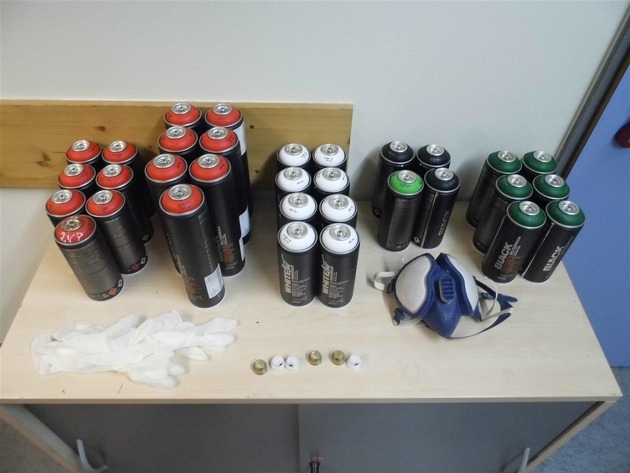 In der Nacht von Samstag auf Sonntag machten Polizeibeamte eine interessante Entdeckung. Der 33-jährige Fahrer eines Pkw und sein 24 Jahre alter Beifahrer führten in ihrem Fahrzeug eine erstaunliche Menge an vollen Farbspraydosen mit sich. Darüber hinaus hatten sie Einweghandschuhe, Sprühköpfe für Spraydosen und eine Atemschutzmaske bei sich. Eine Überprüfung des Fahrers ergab, dass dieser in der Vergangenheit bereits mit Sachbeschädigungen durch Graffiti aufgefallen war. Eine plausible Erklärung für das Mitführen der Utensilien blieben die beiden Männer schuldig, weshalb die Gegenstände zur Verhinderung von Straftaten sichergestellt wurden. Waren für die Nacht "Sprayaktionen" geplant? Die Ermittlungen hierzu dauern an.