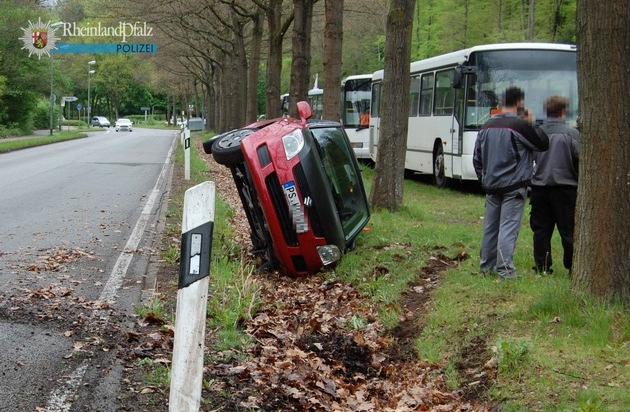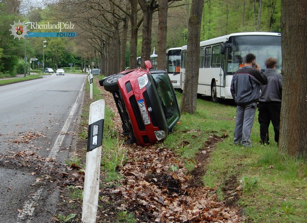 Ein "umgefallenes" Auto in der Bremer Straße ist der Polizei am Freitagmorgen gemeldet worden. Die hinzu gerufene Streife traf auf einen 19-jährigen Mann aus dem Landkreis Südwestpfalz, der gegen 9.45 Uhr aus Richtung Kantstraße in Richtung Dunkeltälchen gefahren ist. Hier verlor er offensichtlich in einer Rechtskurve die Kontrolle über seinen Wagen und kollidierte mit einem Bordstein sowie der Leitplanke. Anschließend rutschte er in den Straßengraben und kippte um. Alle drei Fahrzeuginsassen blieben zum Glück unverletzt. Unfallursache dürfte ein Zusammenspiel von nicht angepasster Geschwindigkeit und fahrerischem Unvermögen gewesen sein.