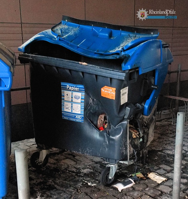 Ein Mitarbeiter bemerkte den zerschmolzenen Müllcontainer, der sich auf dem Gelände des Pfalztheaters am Willy-Brandt-Platz befand, am Donnerstagmorgen und verständigte daraufhin die Polizei. Von den Verursachern fehlt bislang jede Spur.