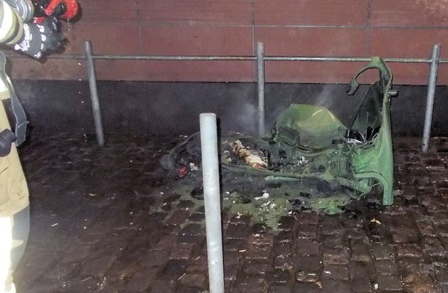 Der Container, der an der gleichen Stelle stand wie der beschädigte am vergangenen Donnerstag, ging am Sonntagabend gegen 23 Uhr in Flammen auf. Der Brand konnte zwar von der Feuerwehr gelöscht werden, allerdings blieb von dem Container nicht mehr viel übrig - der Kunststoff war durch die Hitzeentwicklung fast vollständig geschmolzen.