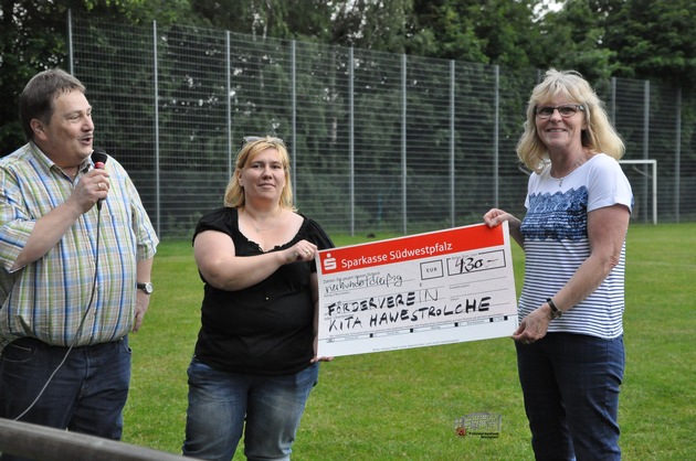 430 Euro hatten Helferinnen und Helfer bis zur Halbzeitpause für den Förderverein der Kindertagesstätte Hawestrolche gesammelt. Und die Spendenbereitschaft der Fußballfans riss auch bis Spielende nicht ab, so dass zur Freude von Stefanie Stephan, Vorsitzende des Fördervereins, und von Annelie Matheis, Leiterin der Kindertagesstätte, letztlich noch der ein und andere Euro hinzukam.