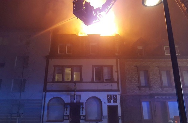 Aus bislang ungeklärter Ursache geriet am 16.03.2016, gegen 20.50 Uhr, der Dachstuhl eines Gebäudes in der Friedrich Ebert Straße in Landau in Brand und entwickelte sich in kürzester Zeit zum Vollbrand des Dachstuhls. Die insgesamt 5 Bewohner konnten das Haus rechtzeitig verlassen und wurden nicht verletzt. Vorsorglich wurden durch die Feuerwehr die Nachbargebäude vorübergehend evakuiert. Nach Abschluss der Löscharbeiten konnten die Bewohner der Nachbargebäude wieder in ihre Häuser zurückkehren. Das Brandobjekt ist momentan nicht bewohnbar. Nach ersten Schätzungen dürfte ein Gebäudeschaden von ca. 200 000 EUR entstanden sein. Bezüglich der Brandursache hat die Kriminalpolizei die Ermittlungen aufgenommen. Die Feuerwehren Landau und Stadtteile waren mit 54 Einsatzkräften, die Polizei mit 8 und DRK inklusive SEG mit 26 Einsatzkräften vor Ort.