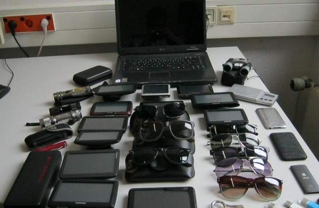 27.05.2016 Nachdem seit März diesen Jahres immer wieder aus unverschlossenen Autos im Wohngebiet "Wollmesheimer Höhe" elektrische Geräte und Gebrauchsgegenstände gestohlen und ein 17 jähriger Landauer Jugendlicher der Tat verdächtigt wurde, weil er sich mehrfach in Tatortnähe aufhielt und von Zeugen gesehen wurde, erfolgte bei dem Jugendlichen am Freitag eine Wohnungsdurchsuchung. Hierbei konnten 12 Navigationsgeräte, acht hochwertige Sonnenbrillen, teilweise mit Etui, ein ACER-Laptop, drei iPads, drei Taschenlampen, ein Fernglas, eine Feinwaage sowie verschiedene Zubehörteile aufgefunden und sichergestellt werden (siehe Bild). Der Jugendliche räumte in seiner Vernehmung ein zwischen 50 und 80 unverschlossene Autos vorgefunden zu haben, bei denen er in rund 30 Fällen fündig wurde und Gegenstände aus den Autos mitnahm. Bisher wurde aber nur in sechs Fällen eine Diebstahlsanzeige erstattet. Entweder haben die Eigentümer den Verlust ihrer Sachen noch nicht bemerkt oder haben auf eine Anzeige verzichtet, weil sie in der Anzeigenerstattung keine Erfolgsaussichten sahen, die zur Ergreifung des Täters oder der Rückgabe ihrer Sachen führen. Die Polizei sucht deshalb weitere Geschädigte, die im letzten Vierteljahr ihr Auto im Gebiet "Wollmesheimer Höhe" geparkt hatten, möglicherweise unverschlossen und die dann einen Gegenstandsverlust im Fahrzeug feststellten bzw. eine Unordnung im Pkw vorfanden. Hinweise nimmt die Polizei unter der Telefonnummer 06341-2870 entgegen oder per mail pilandau@polizei.rlp.de