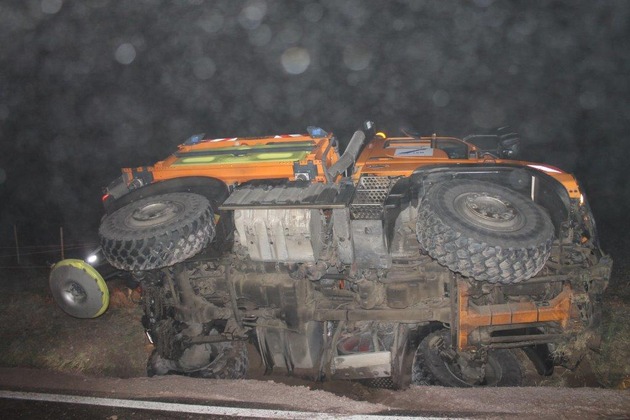 07. Dezember 2016, 6 Uhr Auf der Landstraße zwischen Böchingen und Landau-Nußdorf kam am Mittwochmorgen ein Streufahrzeug der Straßenmeisterei Godramstein auf spiegelglatter Fahrbahn von der Straße ab. Das Fahrzeug drehte sich um die eigene Achse und kippte dann auf der Bankette um (siehe Bild). Es entstand ein geringer Sachschaden. Der Fahrer blieb unverletzt. Die Straße war wegen der Bergung des Fahrzeuges bis um 9 Uhr gesperrt. Ein weiterer Unfall auf reifglatter Fahrbahn ereignete sich am Mittwochmorgen in der Breslauer Straße in Offenbach, als eine 71 jährige Radfahrerin stürzte und mit Verdacht auf Knöchelbruch ins Krankenhaus kam.