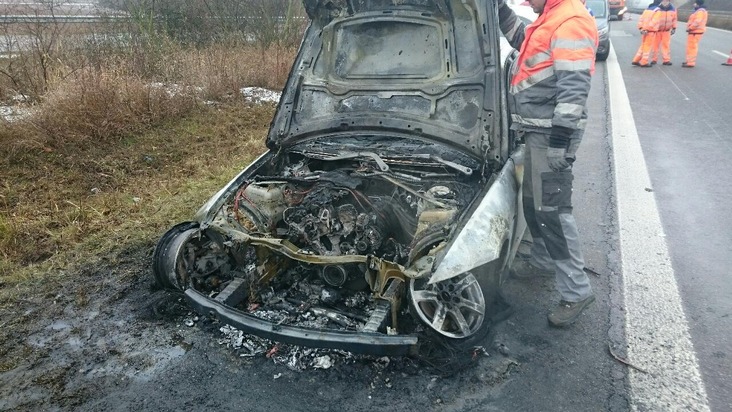Am 09.01.2017, gegen 10:27 Uhr, wurde hiesiger Dienststelle ein brennender Pkw auf der A65, Fahrtrichtung Norden, kurz nach der Ausfahrt Deidesheim/B271 gemeldet. Bei Eintreffen der eingesetzten Beamten stand der Pkw der BMW 3er-Reihe bereits in Vollbrand. Die Feuerwehr war bereits vor Ort und löschte das brennende Fahrzeug. Während der Löscharbeiten waren beide Spuren Richtung Norden gesperrt, die Ableitung erfolgte über die Ausfahrt Deidesheim. Durch starke Rauchentwicklung war auch der Verkehr auf der Gegenrichtung beeinträchtigt. Die Autobahnmeisterei Kandel übernahm die Absicherung und Verkehrslenkung. Nach Brandlöschung konnte eine Fahrspur wieder freigegeben werden. Der komplett zerstörte Pkw wurde abgeschleppt. Brandursache war wohl ein technischer Defekt im Motorraum. Der 20jährige Südpfälzer, der mit dem BMW unterwegs gewesen ist, wurde nicht verletzt. Ein Gutachter wurde durch die Autobahnmeisterei wegen Beschädigungen des Asphalts bestellt. Die Sperrung der rechten Fahrspur dauerte bis in den frühen Nachmittag an.