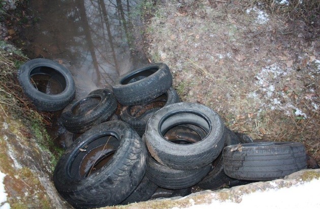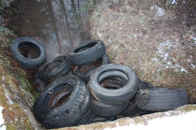Innerhalb der letzten Woche wurde am Oberlauf des Klingbachs in Silz, Brücke am Radweg nach Gossersweiler-Stein, zu beiden Seiten der Brücke, über 60 PKW-Reifen unterschiedlicher Größen in den Wald und teilweise in den Bach geworfen.