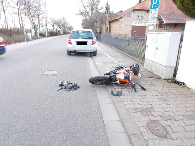 Am 07.03.2017, gegen 17:10 Uhr, wollte ein 88jähriger aus Edenkoben mit seinem Pkw Mercedes Benz von der Schwimmbadstraße in Maikammer nach rechts in die Weinstraße Süd abbiegen. Hierbei übersah er den in Richtung Ortsmitte fahrenden 18jährigen Motorradfahrer aus Maikammer und es kam zum Zusammenstoß der beiden Fahrzeuge. Der 18jährige erlitt dabei Brüche im Handgelenk und im rechten Sprunggelenk, sowie diverse Prellungen und Schürfwunden. Er wurde mit dem Rettungsdienst in ein nahgelegenes Krankenhaus verbracht. An beiden Fahrzeugen entstand ein Gesamtschaden in Höhe von ca. 10.000,-EUR. Neben dem Vorfahrtsverstoß muss sich der 88jährige nun wegen fahrlässiger Körperverletzung verantworten.