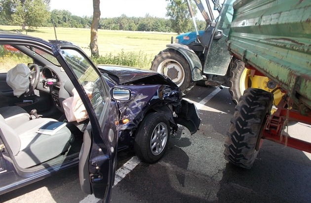 Ein nicht mehr fahrbereites Auto und 3500 EUR Sachschaden sind die Folge eines Verkehrsunfalls am Sonntagmorgen gegen 9.45 Uhr auf der Landstraße 540 zwischen Bellheim und Zeiskam. Ein 20 jähriger Autofahrer überholte einen Traktor, welcher just in diesem Augenblick nach links in einen Feldweg abbiegen wollte. Daher fuhr der Autofahrer dem Traktor in die linke Fahrzeugseite. Der PKW war nicht mehr fahrbereit und musste abgeschleppt werden. Auf Grund auslaufenden Öl´s musste die Fahrbahn gereinigt werden. In dem Streckenabschnitt besteht ein Überholverbot.