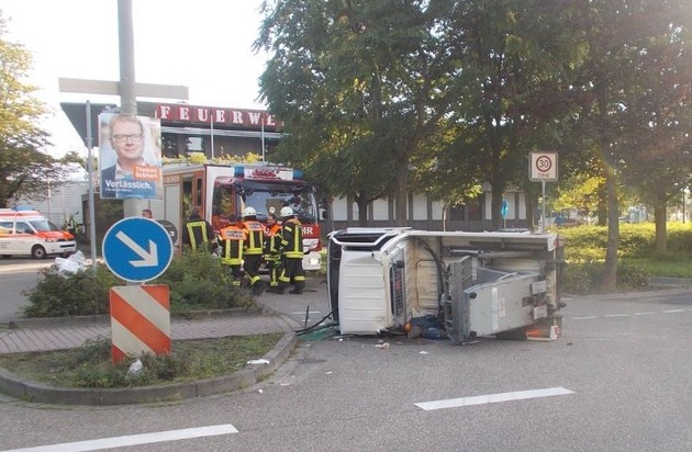 Wörth; Am 15.08.2017 befuhr um 07:35 Uhr ein Reinigungsfahrzeug der Stadt Wörth die Hanns-Martin-Schleyer Straße vom Bahnhof kommend. In Höhe der Einmündung Ahornstraße wollte der 22-jährige Fahrer nach rechts abbiegen. Ein nachfolgender PKW Fahrer erkannte die Situation zu spät und fuhr auf das Fahrzeug auf. Bedingt durch den hohen Schwerpunkt kippte das Fahrzeug auf die Seite und der Fahrer wurde leicht verletzt. Für die Dauer der Unfallaufnahme kam es zu kleineren Verkehrsbehinderungen.