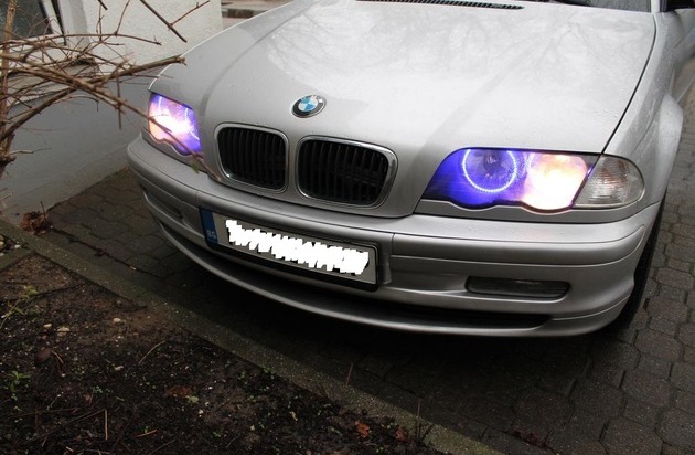 20. Januar 2018, 11 Uhr Am Samstag fiel ein BMW-Fahrer in Herxheim auf, weil er blaue LED-Lampen in seinen Frontscheinwerfer eingebaut hatte (siehe Bild). Bei der Kontrolle stellte sich heraus, dass der Fahrzeugführer einen LED-Ring im Hauptscheinwerfer als "Angel (Engel) Eyes" verbaut hatte. Die Kabelführung -Marke Eigenbau- wurde frei Hand im Motorraum verlegt. Aus dem Fahrzeuginnenraum konnte der Fahrer dann per Fernbedienung die Farbe nach Wunsch ändern. Durch den Einbau der Beleuchtungseinrichtung war die Betriebserlaubnis für das Fahrzeug erloschen, was eine Bußgeldanzeige über 90 Euro nach sich zog. Der Fahrer durfte an Ort und Stelle den nachträglichen Einbau wieder entfernen. Da es sich bei dem Fahrer um einen 22-jährigen Bulgaren handelte, der auf der Durchreise war, wurde bei ihm eine Sicherheitsleistung in Höhe des Bußgeldes plus Verwaltungsgebühren einbehalten.