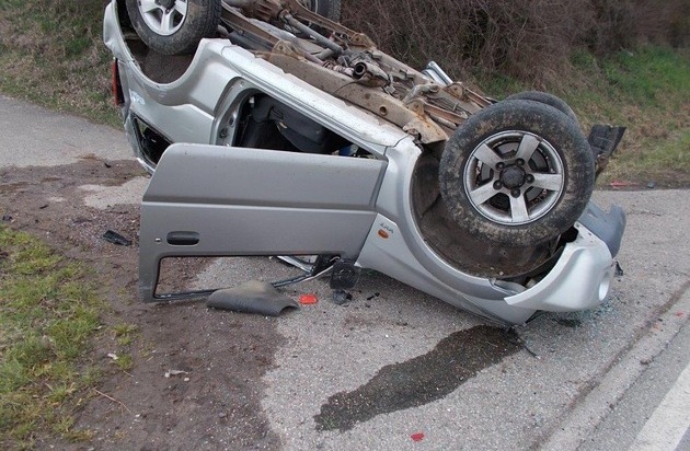 27. März 2018, 16 Uhr Ein Nießanfall brachte am Dienstagmittag einen 47-jährigen Mann aus dem Landkreis Südliche Weinstraße aus der Bahn. Er verriss beim Nießen das Lenkrad seines Geländewagens und kam auf der Strecke zwischen Impflingen und Billigheim von der Straße ab. Das Fahrzeug überschlug sich und blieb auf dem Dach liegen (siehe Bild). Dem Fahrer gelang es sich aus dem Fahrzeug zu befreien. Er klagte über Schmerzen im Brustbereich und wurde vorsorglich ins Krankenhaus gebracht. Am Auto entstand erheblicher Schaden.