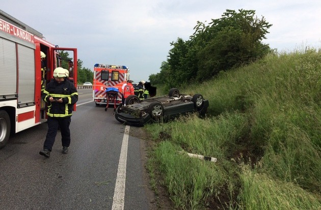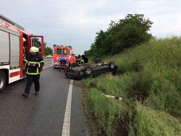 Am 23.05.2018, gegen 09:00h, befuhr eine 43-jährige Pkw-Fahrerin aus dem Kreis Südl. Weinstr. die Auffahrt zur BAB 65 in Richtung Ludwigshafen bei Landau Süd. Noch im Bereich der Auffahrt und der Einfädelspur verlor sie plötzlich die Kontrolle über ihr Fahrzeug. Sie geriet in einen Teil der Böschung, überschlug sich und kam im Anschluss auf dem Dach zum Liegen. Als Unfallursache kommt eine mit Öl verschmutzte Fahrbahn in Betracht. Die Frau wurde im Fahrzeug eingeklemmt und konnte durch die Feuerwehr befreit und anschließend zur medizinischen Versorgung ins Krankenhaus gebracht werden. Die rechte Fahrspur sowie die Einfädelspur wurden für ca. eineinhalb Stunden gesperrt, wodurch mehrere Kilometer Rückstau entstanden.